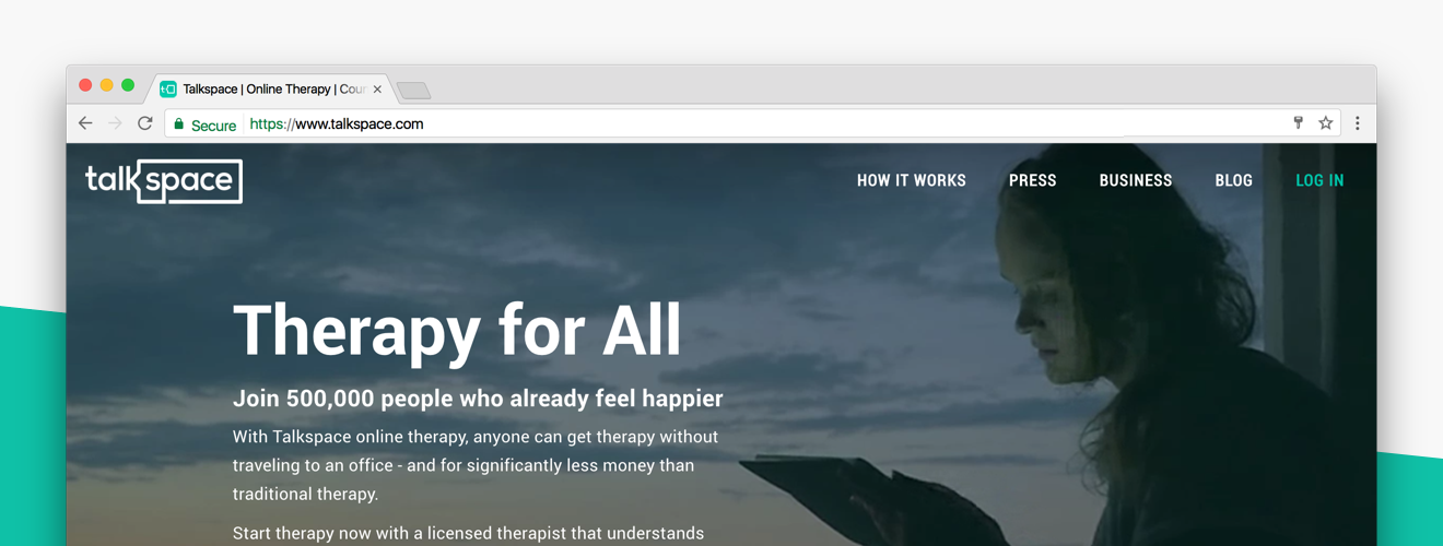 The first part of the homepage shows Talkspace clients making use of the most valuable part of our app: therapy anytime, anywhere. Whether you’re at work, walking your dog or out to a show, you can communicate with your therapist.
